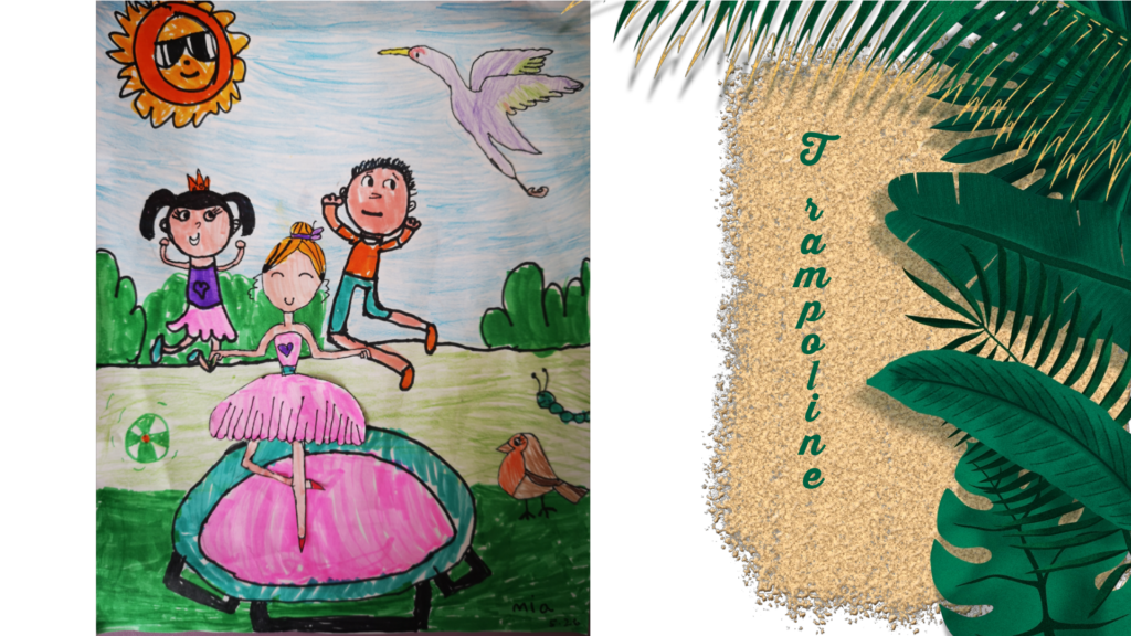 Girl jumping trampoline with “long time no see” friend