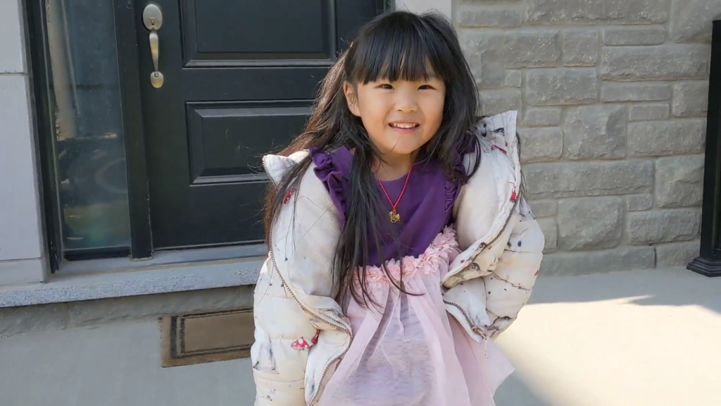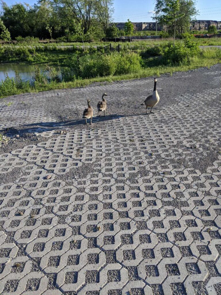 Girl walking by Canada goose